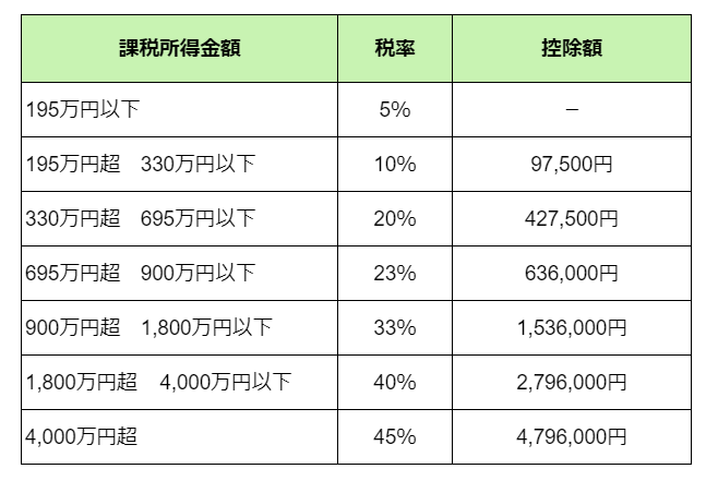 超過累進税率とは、「課税所得が増えればどんどん税率が上がる仕組み」ということを指しますが、あくまで「超過」なので、超えた部分に対して税率が上がります。195万円までは5%、195万超から330万円までの部分は10%となり、195万円を超えたからといって全体が10%になるわけではありません。一定の所得を超える場合、超える部分の金額にだけ高い税率が課されるのです。)そのため、もし所得金額が300万円の場合、表に従い300万円全てに10%を乗じてしまうと、税額が多くなってしまうので、そこで「控除額」が設けられているのです。