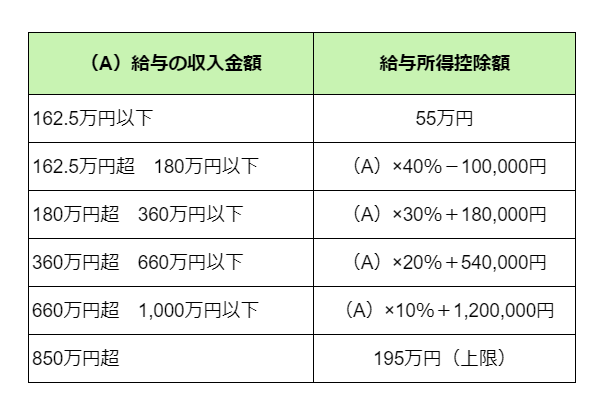 自営業者の場合は必要経費などを収入から差し引きますが、会社員の場合はあらかじめ「給与所得控除額」が与えられています(以下表)。いわば、必要経費の代わりのようなものです。この金額を差し引いた額を「所得金額」といいます。パートやアルバイトであっても、少なくとも55万円は差し引くことができます。