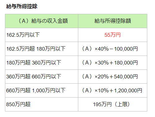 ここでいう所得というのは収入とは違います。収入から必要経費を差引いたものを所得といい、パートやアルバイトも含め給与収入のみの人は以下の「給与所得控除」を差引いて計算することになります。
