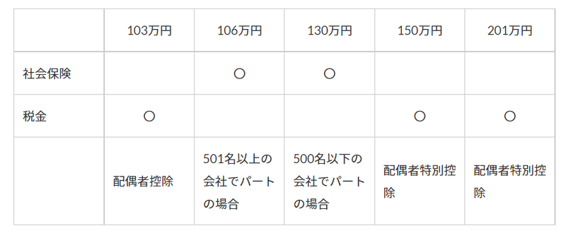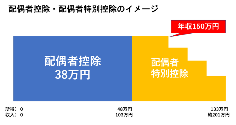 <103万円・150万円・201万円の壁・まとめ> ・103万円:配偶者控除を適用することができる上限 ・150万円:配偶者特別控除と控除名が変わるものの、配偶者控除と同額の38万円控除 を適用できる ・201万円:配偶者に対する控除がゼロになる |